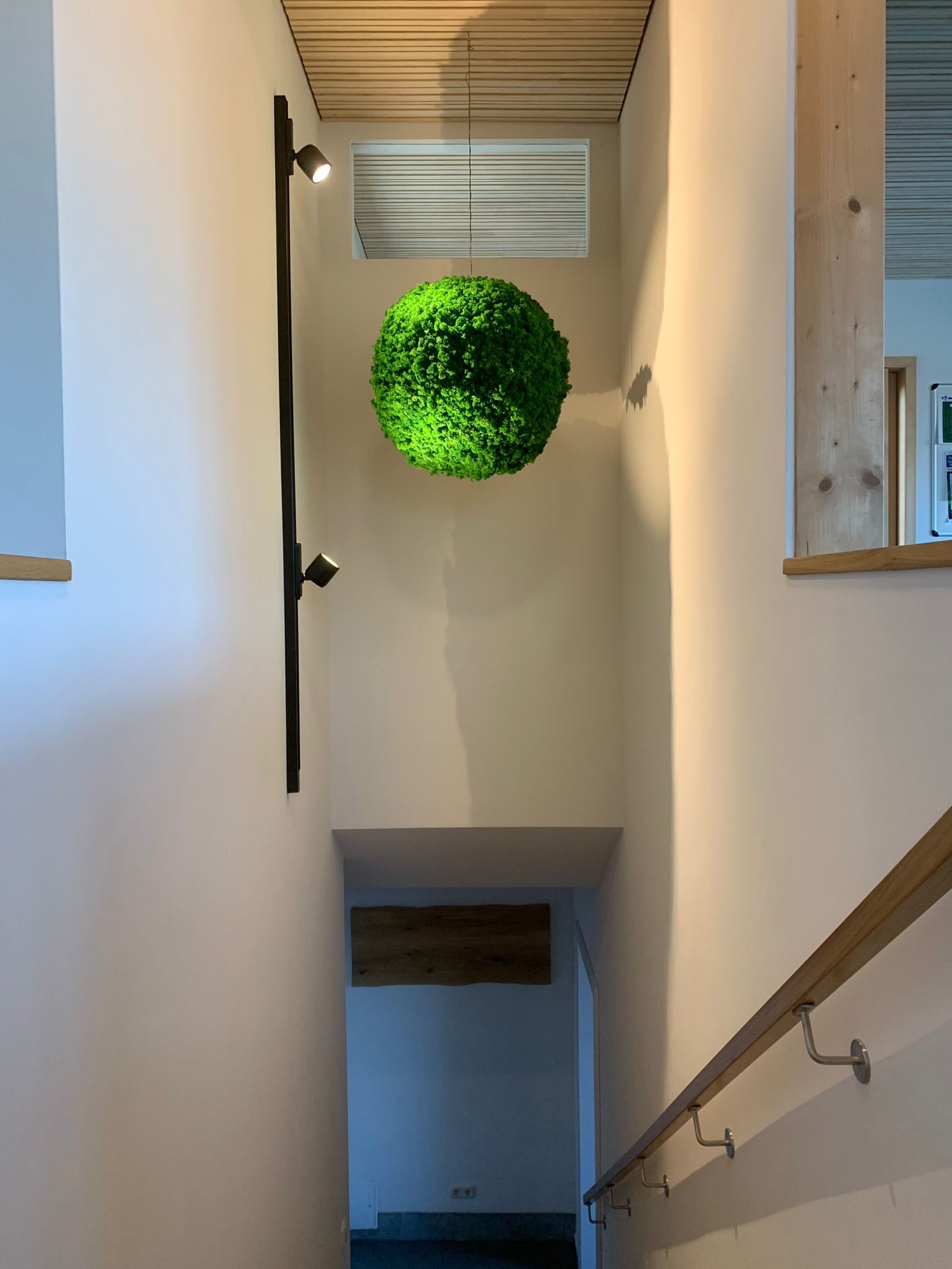 Ideal für Büros, Praxen oder Wohnzimmer, setzt die Mooskugel überall natürliche Akzente. Sie ist in variablen Größen anzufertigen und somit perfekt an Ihre spezifischen Bedürfnisse anpassbar. Platzieren Sie eine große Mooskugel als Mittelpunkt in einem großen Raum oder kombinieren Sie mehrere kleinere Kugeln, um ein individuelles Arrangement zu schaffen. Egal, wie Sie sie einsetzen, die Mooskugel ist ein attraktives Element, das Ihrer Raumgestaltung eine frische, organische Note verleiht.